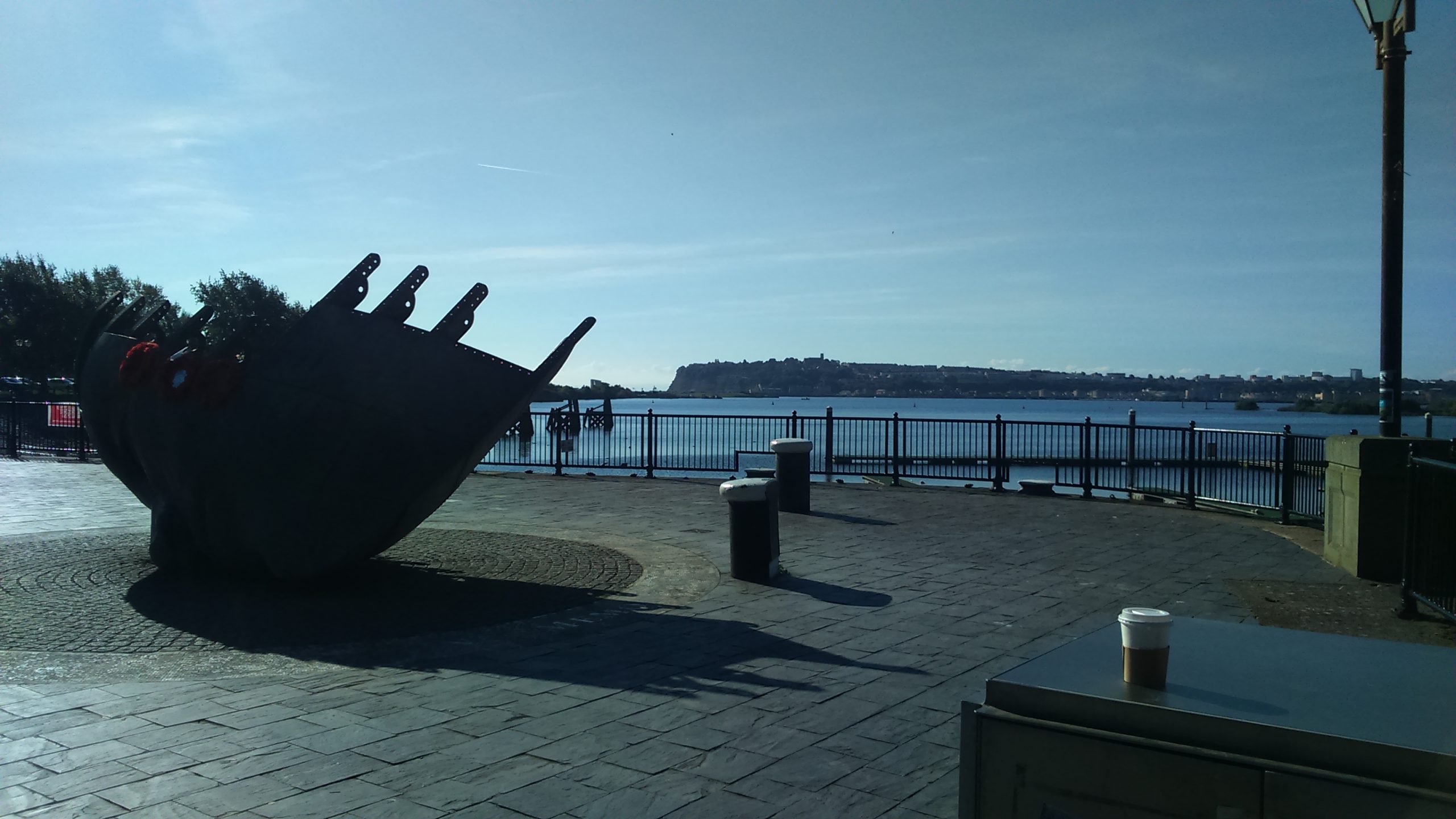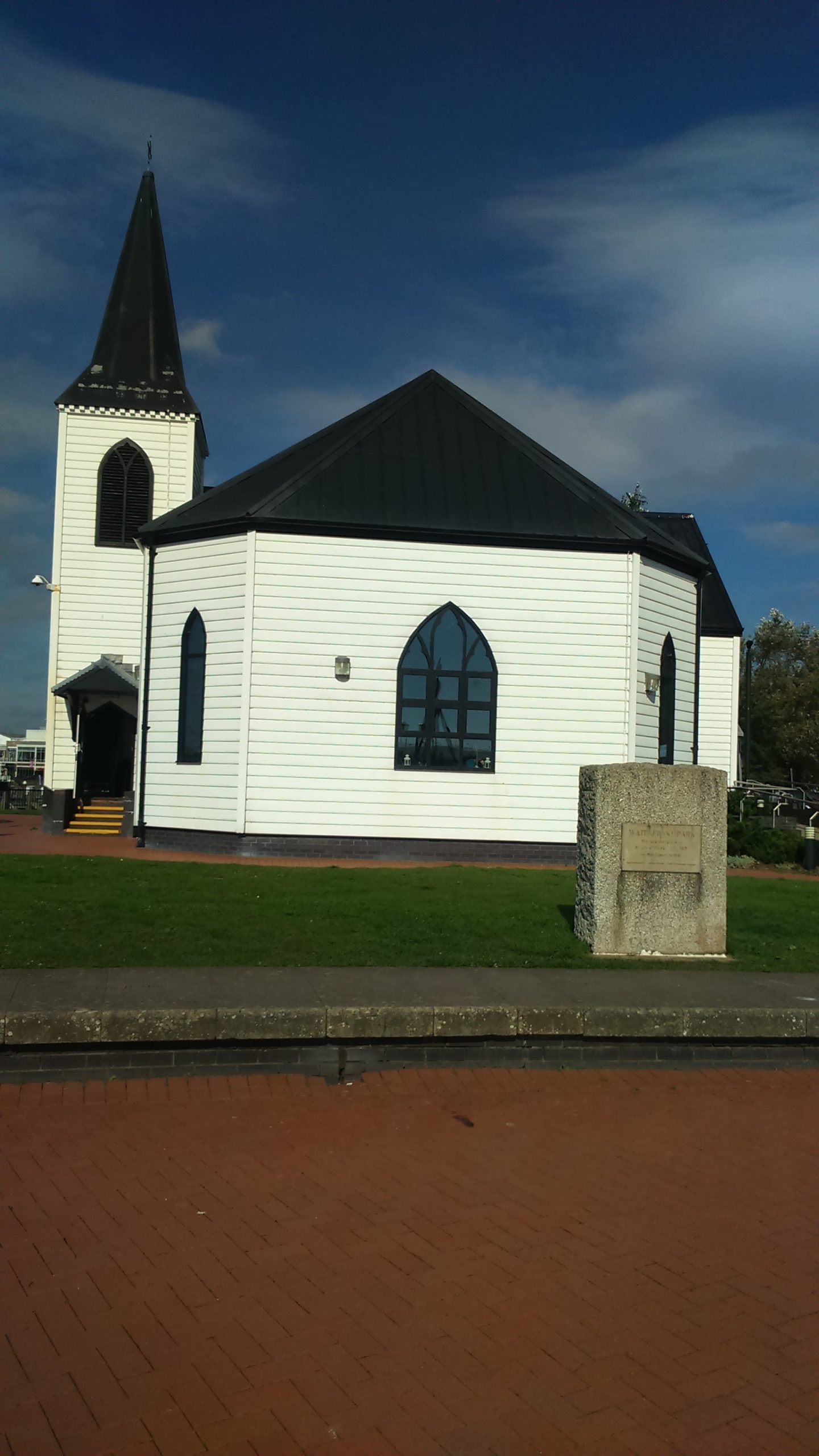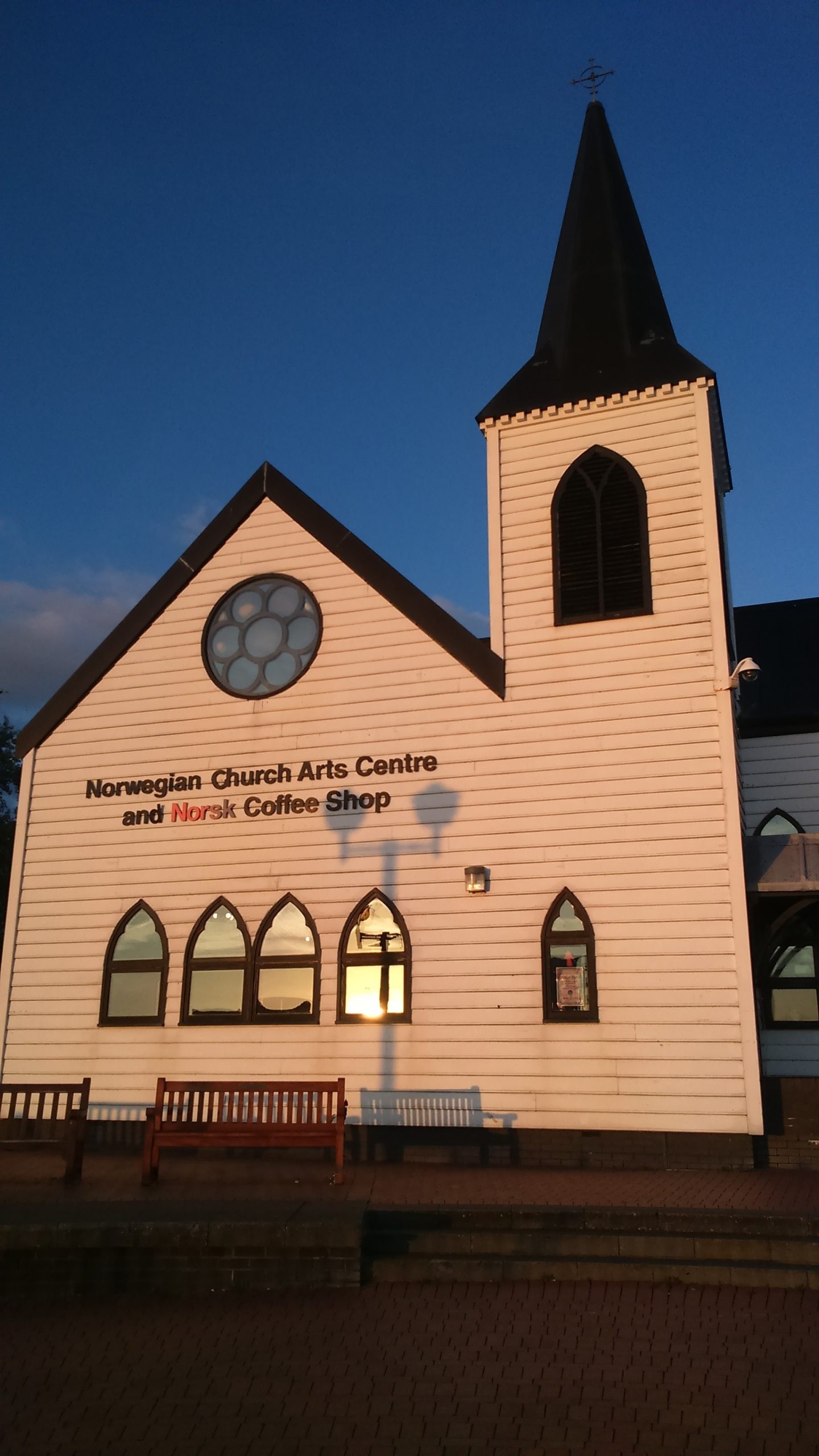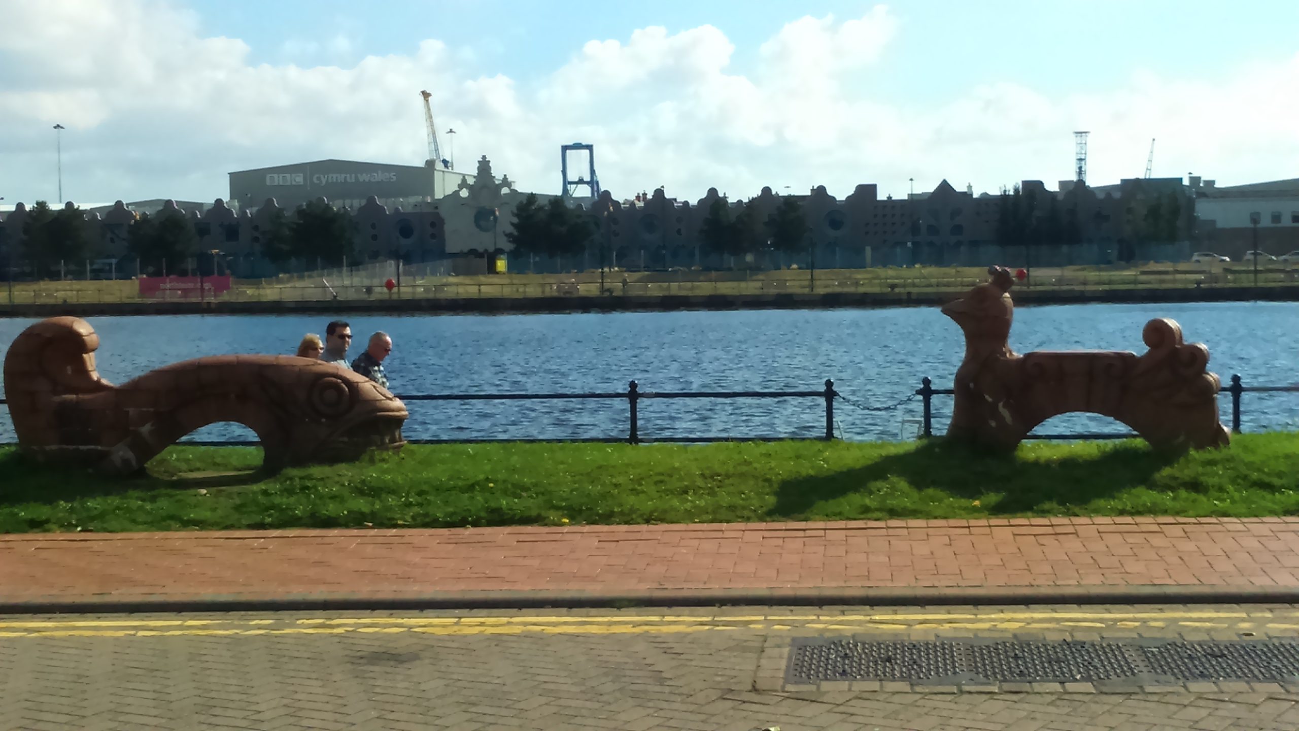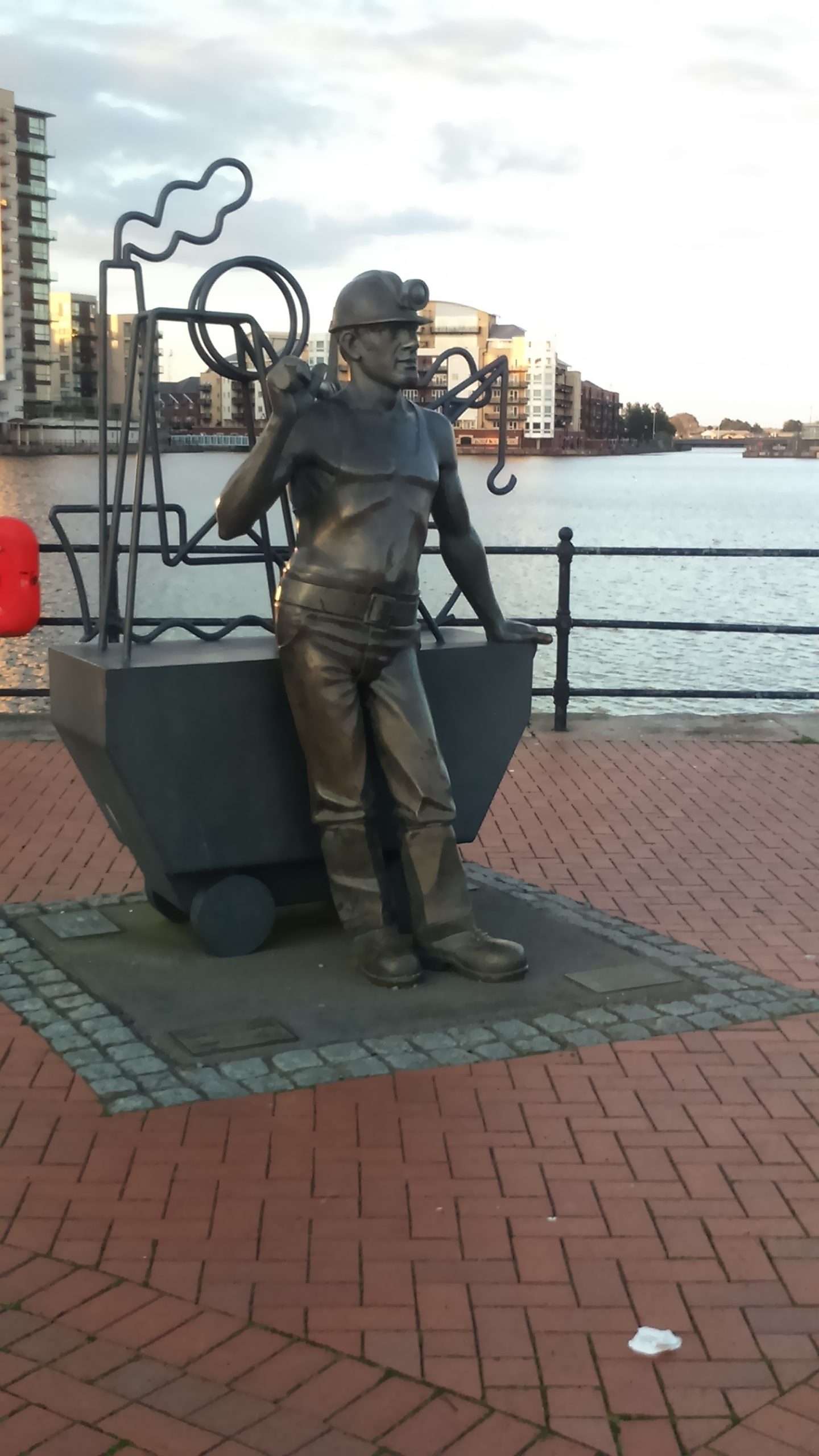 Esculturas em tijolo, e os estúdios da BBC ao fundo; bar feito com técnica de telhas de madeira sobrepostas; homenagem aos mineiros; Igreja Norueguesa e Restaurante Madeirense!!!!
