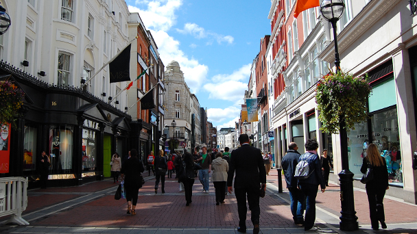 Vindo do trinity college saímos para a rua pela Nassau street, com imenso movimento de carros, autocarros e lojas comerciais, viramos à esquerda e temos a Grafton street, rua sem transito, ladeada de lojas comerciais, mas com muita vida, tem artistas de rua a fazerem de tudo –  escultores; desenhistas; estatuas humanas; bailarinos; acrobatas e músicos, estes tocam todo o género musical e tipo de instrumento.